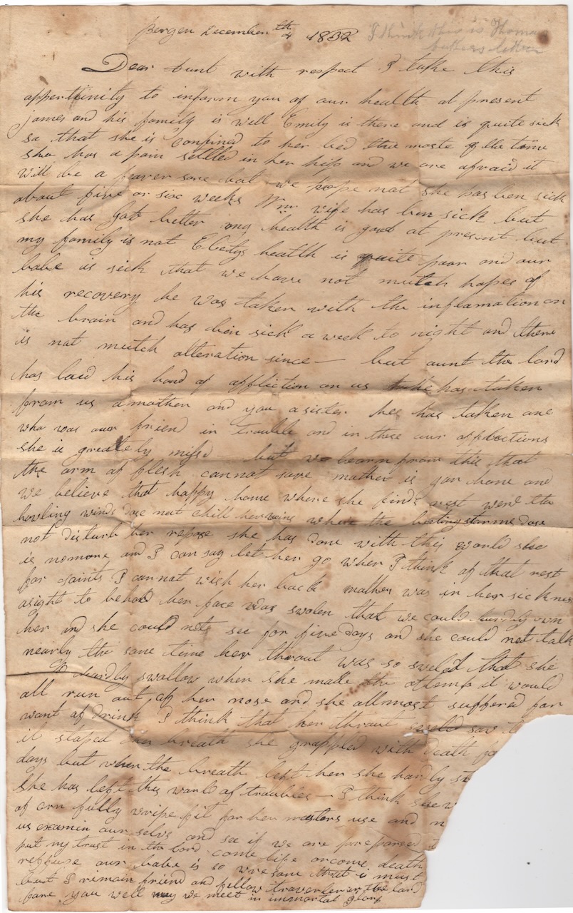 Dear aunt with respect I take this opportunity to inform you of our health at present. James and his family is well. Emily is there and is quite sick & that she is confined to her bed the most of the time . She has a pain settled in her hips and we are afraid it will be a feaver [?] save that we hope not. She has been sick about five or six weeks. Wm. wife has been sick but she has got better. My health is good at present but my family is not. Unreadable [starting with C or E?]s health is quite poor and our babe is sick that we have not mutch hopes of recovery. He was taken with the inflammation on the brain and has been sick a week to night and there is not mutch alteration since. But aunt the lord has laid his hand of affliction on us he has taken from us a mother and you a sister. He has taken one who was our friend in trouble and in these afflictions she is greatly missed.But we learn from this that the arm of flesh cannot save mother is gone home and we believe that happy home where she finds rest when the howling winds unreadable not chill unreadable where the unreadable storms does not disturb her repose. She has gone with thy unreadable and she is no more and I can say let her go. When I think of that rest for saints I can not wish her back. Mother was in her sickness a sight to behold. Her face was swolen that we could hardly unreadable her and she could not see for five days and she could not talk nearly the same time her throat was so sweled that she could hardly swallow. When she Made the attempt it would all run out of her nose and she allmost suffered want of drink. I think that her throat sweled so [missing] it stoped her breath she grappled with death for [missing] days but when the breath left her she hardly s[missing] She has left the world of troubles-- I think she w[missing] of can fully unreadable fit for her unreadable use and n[missing] us examine [?] our selves and see if we are prepared to [missing] put my trust in the lord, come life or come death [missing] reffuge out babe is so unreadable that I must [missing] but I remain friend and fellow traveler in the land [missing] find you well may we meet in immortal glory.